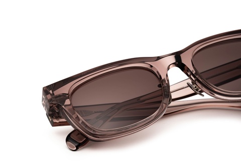 フレームカラーのクリアピンクと聞くと、とっつきにくい印象があるかと思いますが、実際はご覧のように落ち着きのあるカラーになり使い勝手も良く優秀なカラーです。昨年夏にご紹介した際は「col.321」(茶ササ)をサングラスにしてみましたが、今回はクリアピンクにブラウンのカラーレンズを組み合わせています。