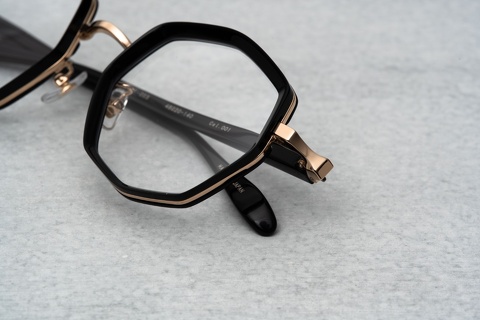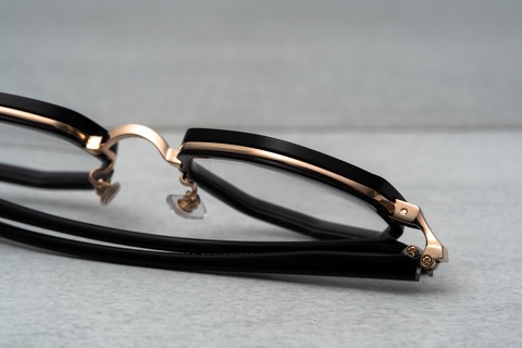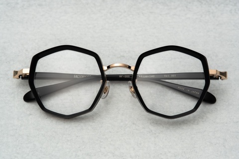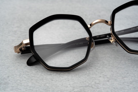 男女を問わず人気といいながらも、やや女性よりな「RF-055」は、多彩なカラーバリエーションも魅力の1つかと思いますが、男性に人気のカラーといえば、なんといってもこちらの「col.001」(黒)です。アセテートパーツの黒とメタルパーツのゴールドはもはや秀逸といえる組みわせ、高級感とともにシックな印象を与えます。