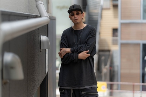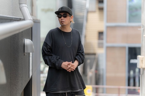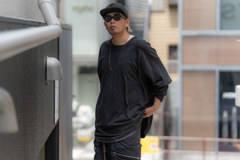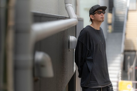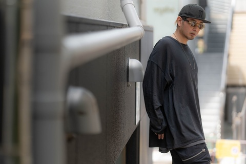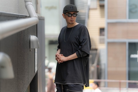 しかし、カラーレンズを組み合わせることでフレームとの一体感が生まれ、直線的なラインが際立ってしまうことを抑えます。特にこの日は「RF-006」の強さとバランスを保つため、あえてキャップを被って撮影を試みました。直線的なラインとツバのラインがリンクし、オーバーサイズのシャツが全体的なバランスを整えます。