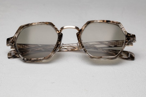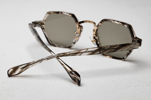 FACTORY900 RETROのコレクション以外にもヘキサゴン型(六角形)のモデルは多数存在しますが、やはり比較的オーソドックなシェイプに比べクセのあることは間違いありませんが、この「RF-057」に関してはフロントに施した面カットに丸みをもたせることで、そのシェイプが際立ってしまうことを抑え、顔馴染みの良さを作り出しました。