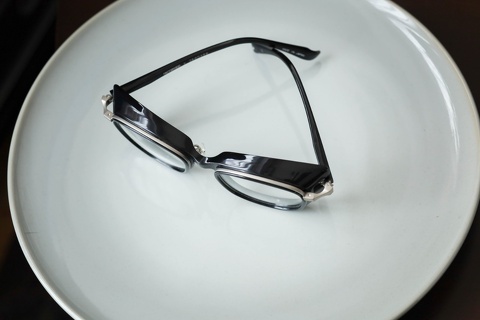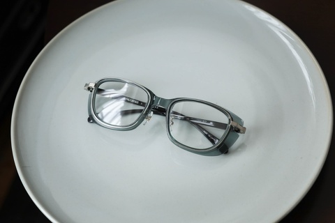 シルバーのメタルにプラスチックフードを組み合わせたデザイン。細みに仕上げていることからかけ心地もよきです。