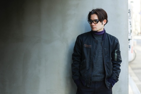 MA-1やレザーブルゾン、ワークジャケット系など男らしいスタイリングと相性抜群。また調光レンズなどを入れてサングラスにしてもかっこいいですね。最近柔らかめカジュアルな佐藤のスタイリングでも(この日はちょっとハードめですが)、かけこなしているのではないでしょうか。