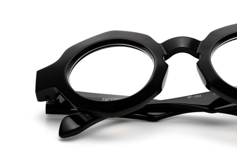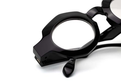 ご覧のように無骨でシンプルな造形に不規則な多角形を組み合わることで、レトロシリーズのなかでもより特徴的なスタイルを生み出しました。そのフューチャリステックな印象を際立てるフロント面は熟練の職人の手によって丁寧に磨き上げられ、アセテートとは思えない硬質な質感を生み出します。