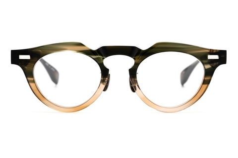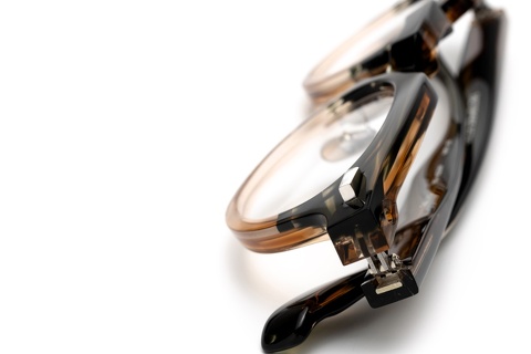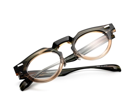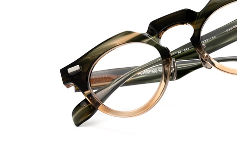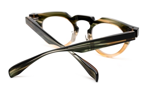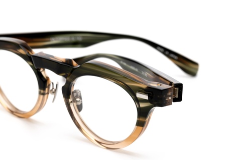 特にベースカラーのグリーンササは「RF-046」の硬質な印象を和らげ、そのクセの強さを調和します。特にテンプルは厚みをそぎ落としていることもあり、フロントに比べササ柄ならではの色合いが存分に楽しめます。