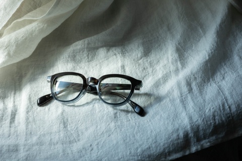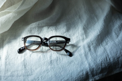 このツートンカラーも、とっても素敵カラー。グレーとブラウンのツートンという非常にめずらしいカラーです。かなり濃いめに映るため、肌に乗せてみると黒に見える場合もあります。ただ、ちょっと色味を変えるだけで、かけ比べをしていただくと顕著にわかるのですが、黒では重く感じる方でも難なくかけていただくことができます。落ち着いたカラーなのでシーンレスでスタリングしていただけます。