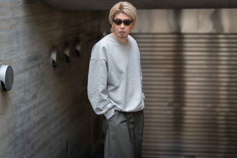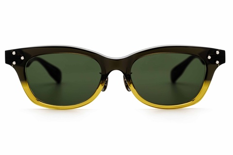 フレームカラーのカーキ/イエローツートンに合わせ、カラーレンズは濃度84%のグリーンを組み合わせました。オリジナリティ溢れるツートンカラーは一見掛けこなしのハードルが高いと思われがちですが、実は見た目以上に顔馴染みが良いことは過去のスタイルサンプルでも触れた通りです。