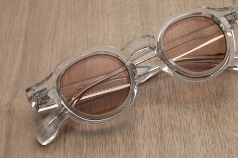 レトロシリーズを代表する人気モデルであり、国内外を問わず高い評価を得た「RF-001」ですが、ビジュアルには「col.165」(バラフツートン)が採用されることが多く、クリアカラーの存在をご存じない皆さんもいらっしゃるのではないでしょうか。ちなみにこちらの「col.850」(クリア)は、以前から大文字シリーズでも採用されており、クリアフレームの大半がこちらを採用しています。