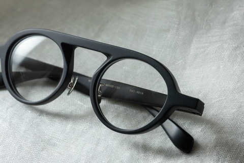 フレームのディテールに戻りますと、フラットで平面的な造形と、ブリッジ部分のエッジを効かせることにより、お顔はのっぺりすることなくかけていただけます。近年トレンドにもなりつつあるハイブリッジフレームではありますが、それとはまた一味違うデザインとなっています。かわいさとかっこよさが一つのフレームの中に共存する稀有なフレームではないでしょうか?「col.001 マットブラック」は特に面造形がはっきりと出るため、デザインを楽しみながら、マットによる肌馴染みのよさも発揮します。