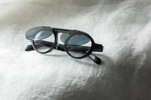 跳ね上げの装着が邪魔にならずにスッキリとしたデザインになるのも”専用”ならではです。そのフレームのカタチに合わせて作っているのでとてもかっこいい。ハイブリッジならではですね。また、フレームに厚みがあるため、別注で金具を作っていただいております。そしてレンズの上には密かに隠れ「ファ」のロゴ。それがゆるくてFACTORY900オリジナル感があっていいですね。