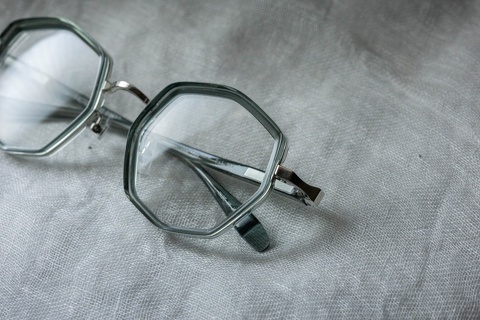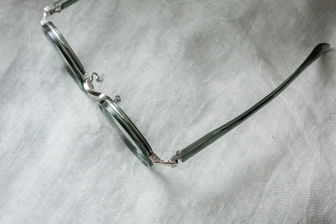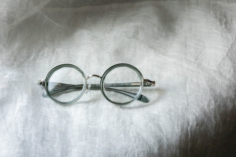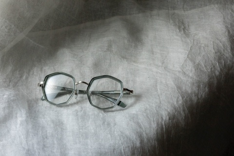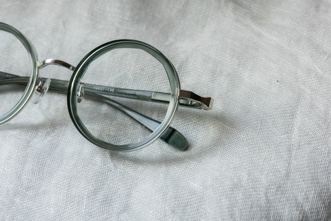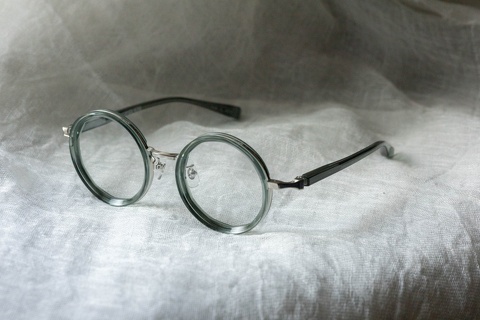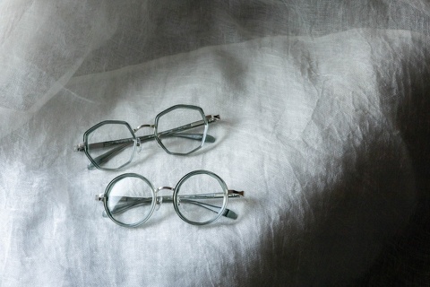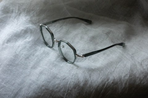 なんと言っても内側が11角形。多角形とはいえ、角が多いのでほぼ丸に見えます。それでもこのちょっとした違和感が飽きることなくかけることができ、光が当たった時の反射がお顔の中で光を集め、とても美しいモダンな丸フレームです。そのカタチを包み込むような色合いのペールグレー。