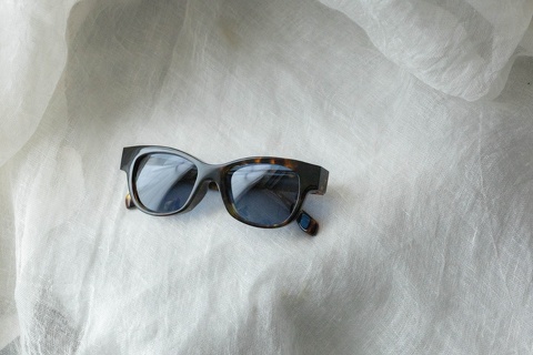 角度を変えてみた時の存在感は圧巻です。ウェリントン型と言えど、絶妙にお顔に沿ったカーブを描いており、サングラスになるとモード感溢れるデザインに。オーセンティックな柄とカタチでスタイリングの品格がより高まります。