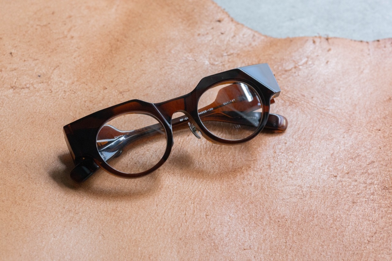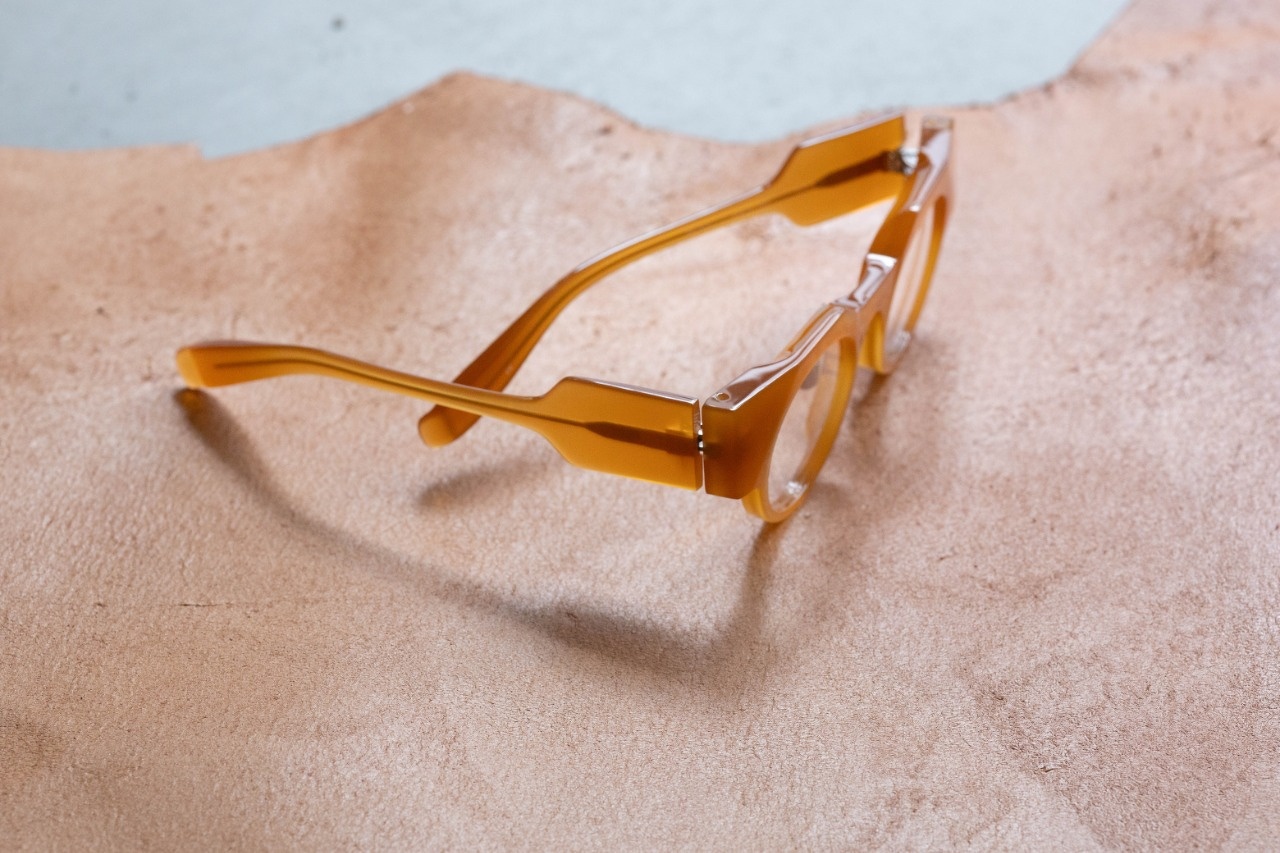私も持っているこちらのモデル。実際にかけてみて、本当にかけやすい。重たそうな厚みをしていますが、重心バランスが考えられている、とてもかけやすい不思議なモデルです。そして、のっぺりとしそうでしない薄ら入った絶妙なカッティングは、まさにFACTORY900ならではのものです。面が大きいため、磨くのがとても難しい、職人泣かせのデザインです。