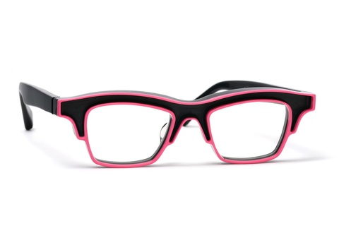 フロントの前面を、縁を残すように掘ることで、メガネのラインだけが浮かび上がって見え、ひとたび掛けると顔にメガネの落書きをしたようなポップな印象に。