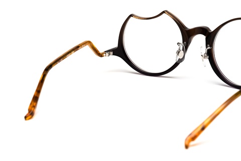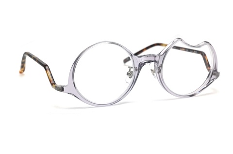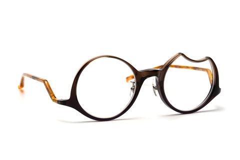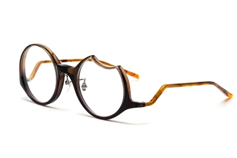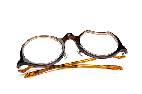 「fafj-002」のコンセプトをそのまま受け継ぎ、”月”、左は上弦の欠けた月、右は満月という一度見たら忘れることの出来ないアシンメトリーなレンズ形状。智元に関しては一般的なメガネに比べやや下に設置しており、そこから繋がるテンプルは月にかかる雲をイメージし、見る角度によって変化する独特な形状になっています。
