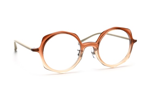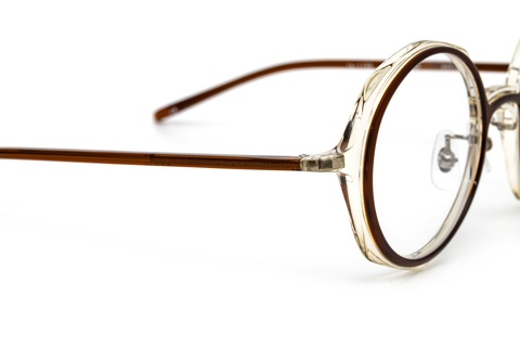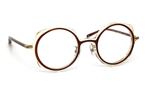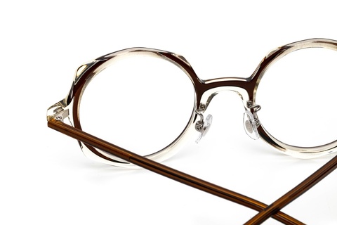 特に今回ご紹介する「col.317」(キハク/ビール茶)は、クリア系のカラーのためお顔に溶け込み、切削により残した縁取りが浮き出るように、まるで細い丸メガネを掛けているかのような錯覚を与えます。