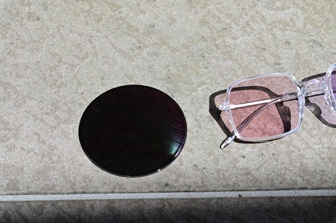 同じく、レンズメーカーHOYAから発売の調光レンズ グレイのサンプルレンズを隣に置いてみましたが、約20秒ほどでここまで濃く発色しました。