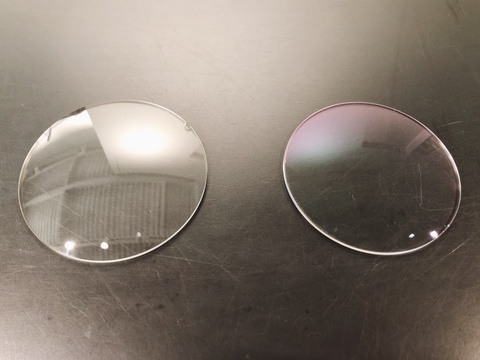 ↓の画像では私たちが使用しているデモレンズと反射防止のコーティングが施されているレンズを並べてみました。