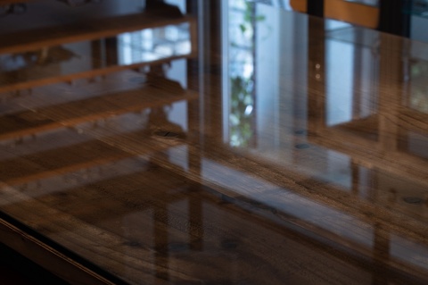 TOKYO BASEのセンターテーブルですが、ご覧のようにテーブルの上に設置しているガラス面への映り込みが、偏光レンズを通した方が明らかに軽減されています。