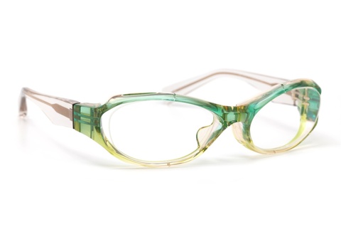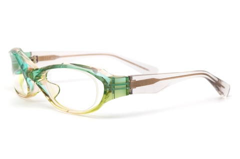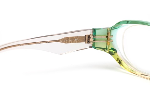 非常に鮮やかなツートンカラーは、ソリッドなレギュラーカラーに比べ、ポップでカジュアルな印象を受けますが、「FA-404」の完成された面造形によって、むしろ高級感が増したように感じます。また、今回の限定カラーには特別仕様ということで、バネ丁番、ネジ、テンプルの芯金に使用している金属は全て金メッキが施されており、お顔にのせた状態でもその様子がご覧いただけるのもトランスペアレントならではです。