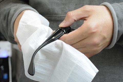 こうなった場合、ウエットテッシュや汗ふきシートなど、アルコール系の成分が含まれるシートでメガネを拭いてしまうのはNGです。一見キレイになりそうですが、シートに含まれている成分がよりフレームにダメージを与えることになります。