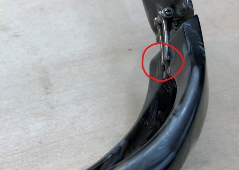この部分は、今回修理していない方のバネ蝶番です。修理した方と見比べると、少し浮いてきているのがわかりますね。
