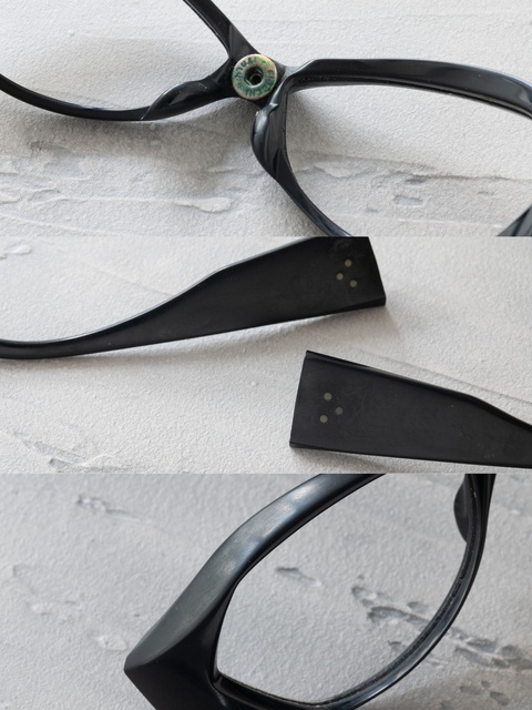 ご存知「FA-160」は、皮のフードが脱着できるコンビネーションフレームになっておりますが、ブリッジの裏側にはスナップボタンの金属が埋め込まれています。長年ご使用いただくなかで、この金属パーツや丁番には緑青も見受けられます。表面の研磨はもちろん、フレームを分解し細部の汚れも取り除きます。