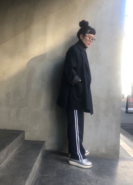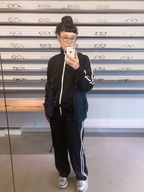 下の写真は、次の日同じRF-101で差をつけたかったため、ギーク(おたく)っぽく仕上げるために、トラックジャケットにトラックパンツをあわせた、ザ・ジャージスタイルです。その上からナイロンベストをあわせてミリタリーの要素も入れてちょっとマニッシュぽさのスパイスを加えました。
