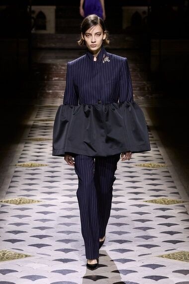 また、上の画像のような、すっきりとしたマニッシュなスーツに、ギャザーが膨らんだエレガントなドレスをドッキングさせたスタイリング。このようなスタイリングは、通常ON TIMEで着るのは難しいとは思うけれど、こういった二面性・違和感のある組み合わせが今年らしいスタイリングとして提案されています。