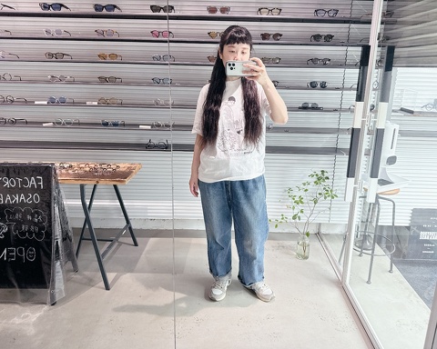 ちなみに、トップスを変えるとこんな感じ。おしり周りは、おばさんには気になりすぎるところ。ちょっと隠れるタイプのトップスを持ってくるといいのだけど、デニムのタイプによって、シャツだったり、Tシャツでもデザイン性のあるものに変化させると良いと思う。私は、この日は暑さが和らぎ、ちょっとだけ肌寒かったので、前後で長さが異なる半袖のスウェットにして、前だけインしている。