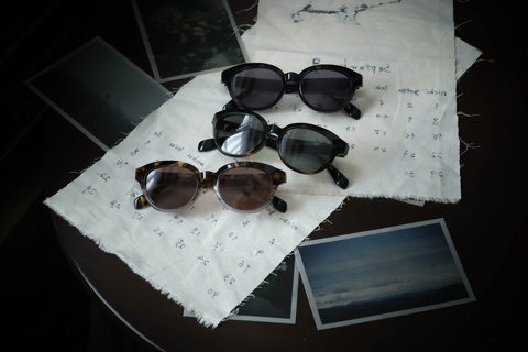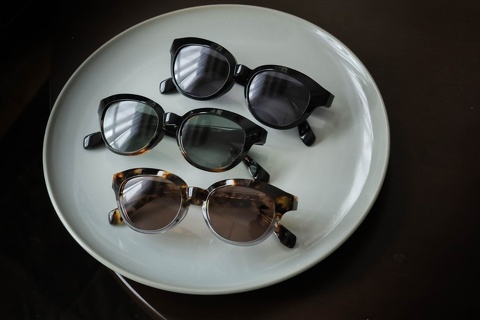 なんとも言えないこの玉型。丸みのあるカタチでありながら、角度を変えるとちょっと無骨。はい、好みですね。少し大きめということもあり、サングラスにすると抜群にカッコ良いと思いませんか?しかも濃度濃いめのカラーにも負けない厚み。でも意外とかけ心地もよく、その理由の一つとして鼻幅がとても狭めということもあり、鼻盛りを必要としなくてもいけてしまうデザイン。そしてブリッジが狭いことによって、その独特の玉型が生かされているようにも見えます。優しい”バタフライ”型のような感じ。リムは上下で厚みを変えており、フロント上部から智にかけてボリュームを出すことで、一見シンプルでも重厚なウェリントンにも見えます。レンズカラーはシンプルに”グレー””ブラウン””グリーン”を入れてみました。