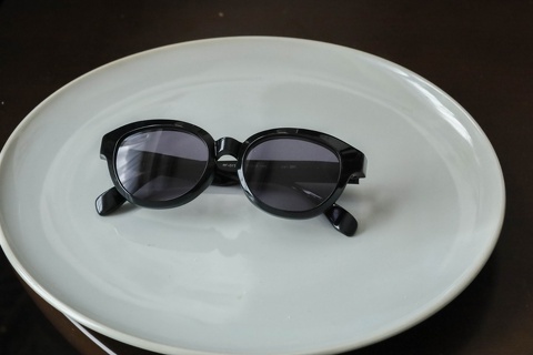 スウェットなどのルーズなスタイルに合わせるとドレスアップしてくれるような、計算し尽くされた適当感を出すことができますね。重さを感じさせるかもしれませんが、斜めにエッジが効いていることによりどの角度から見ても美しいサングラスです。
