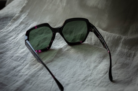 「RF-024」フロント前面のカットに、60年代から70年代を彷彿とさせる変則的な玉型を組み合わせたモデル。ビッグシェイプではあるものの、フロントの面造形により重たく見せない作りになっており、レトロなオーバーサイズ感と、正面から見ると「X」のように見える変則的な玉型により、フューチャリスティックな仕上がりになっているため、今もなお色褪せない唯一無二なデザインに。