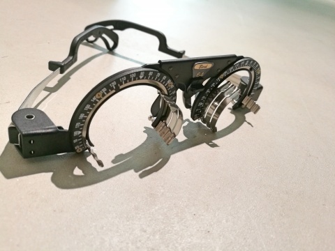これはトライアルフレーム(試験枠)と言われるもので、人によっては「仮枠」と呼ぶ道具です。テストレンズと言われるレンズを脱着することで、視力検査を行ったり、被検者に処方度数を試してもらったりします。