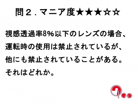 これについては、問1.で出た、視感透過率75%のレンズにも適用され、夜間や夕方では、運転での使用禁止に加え、歩行での使用も禁止となっております。