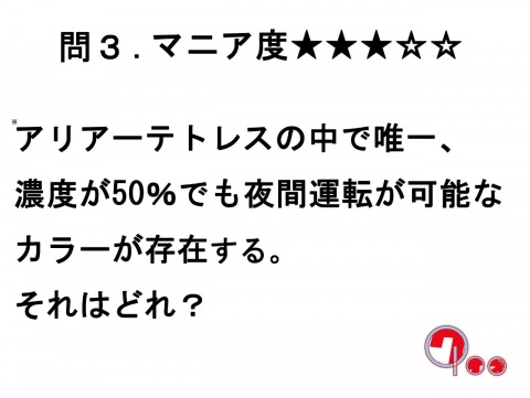 アリアーテトレスの中には「スパーキーイエロー」というカラーがあります。濃度は50%のものでも光量不足にならないためか、夜間運転で使用ができるカラーになっておりす。