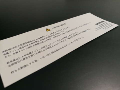 内容は金属メッシュによる怪我や衣服へのダメージの注意喚起。金属メッシュの端の部分に引っ掛かるとそれらを誘発する可能性があるため、認知していただくべく付属しております。もちろん、直営店では、ご対応の段階でその可能性を説明しております。