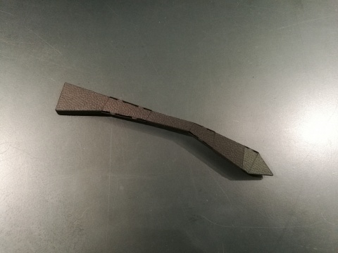 問題に出した赤丸の部分はテンプルになります。ひと際、長いパーツなので分かりやすかったのではないでしょうか。このテンプルに取り付けることになるヒンジの部分も、もちろん紙で作られていますが、紙の特性を生かし、開閉に抵抗が生まれるようになっています。