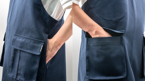 マチ付きなので容量が有り作業に必要な工具がしっかり入ります。フラップ付きなので中に入れた物は落ちにくくなっており、眼鏡を磨く作業時の細かい粉(くず)が入りにくく現場(工場)で使用することを前提としたデザインです。左脇にはパンツのポケットに入れている携帯電話を取りやすくする為に、コンシールファスナーで開閉できるスリットを。左腰ポケットには眼鏡のテンプルエンドのフォルムを感じる様な、コードパイピングを入れた切り替えが施されていたりと、そのデザインにも拘りました