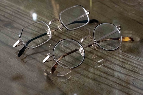 ラウンド型をベースに、レンズを支える左右のリムを折り紙のように内側に折り込んだ「YA-030」