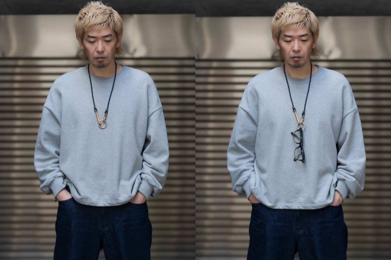 どこかクラフト感があり、FACTORY900の重厚なデザインともバランスがとれるよう金属のパーツは真鍮を用いたグラスホルダー。メガネホルダーとしてはもちろん、アクセサリーとして身に着けていただくのもありですね。