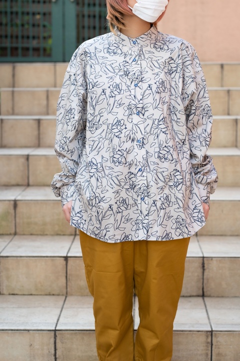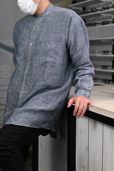 ドレスシャツだけでなく、このようにカジュアルなバンドカラーシャツも対応しており、シャツの生地はもちろん、衿やポケット、ボタン、刺繡のカスタマイズなど、様々な組み合わせを楽しんでいただけます。